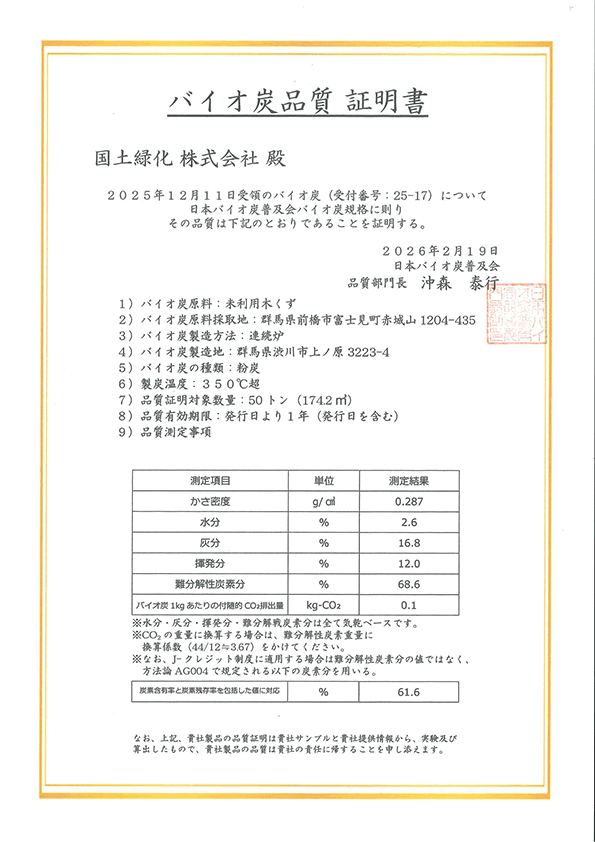 『バイオ炭』品質証明取得のお知らせ -脱炭素型法面緑化資材- このたび、当社が製造・販売するバイオ炭製品につきまして、第三者機関による品質確認の結果、『バイオ炭』としての品質が正式に証明され、証明書が発行されました。 本製品は、木質バイオマスなどの地域資源を原料として製造した環境配慮型資材です。 土壌改良材や緑化基盤材として活用できるだけでなく、炭素を長期的に土壌へ固定することで、CO₂排出量の削減やカーボンニュートラルの推進に貢献する資材として期待されています。